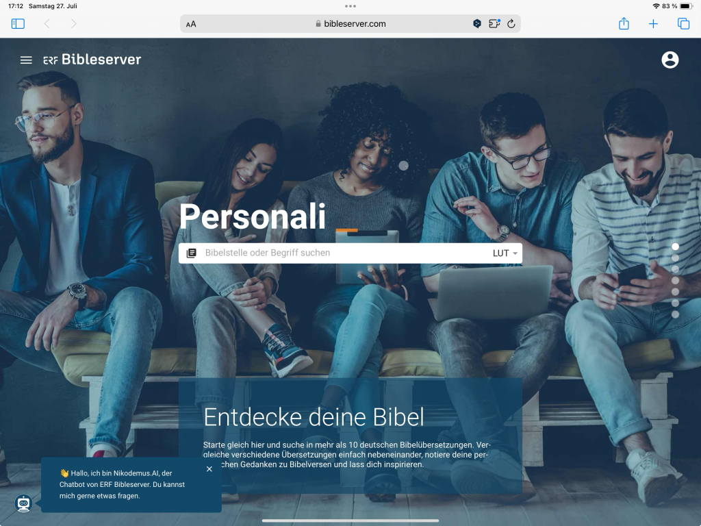 Über den Browser können sie verschiedene Bibelübersetzungen aufrufen und nebeneinanderlegen. Der Bibelserver von ERF bietet viele Funktionen an. Den Bibelserver erreichen sie über die Website: w w w. b i b l e s e r v e r.c o m