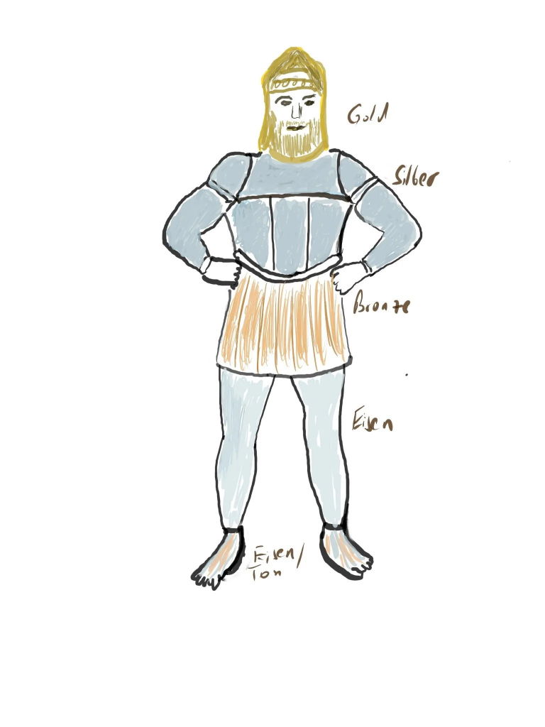 Der König träumte von einem Standbild (siehe nachfolgende Zeichnung), das aus verschiedenen Materialen bestand. Es geht um Gold, Silber, Bronze, Eisen und ein Gemisch aus Eisen und Ton. Darüber hinaus spielt ein Stein eine Rolle, die alle Reiche zerstören wird. Was hat das alle zu bedeuten?